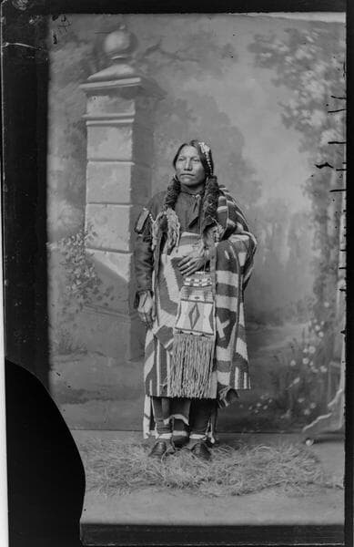 A man called Galote standing in photographer's studio, holding blanket. He is dressed partly in western and partly in native clothing.