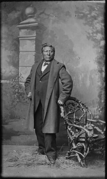 The man is standing in photographer's studio, wearing partly western and partly native clothing and jewelry.