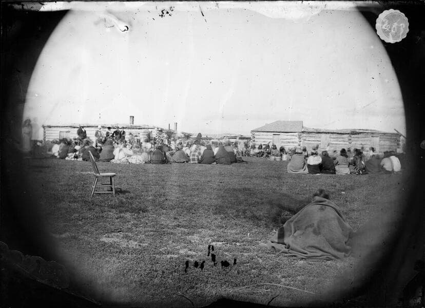 People seated in a circle around a smaller group in the center. A horse-pulled wagon is in the background.