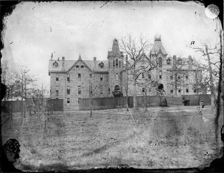 Group portrait of white teachers and other employees at the school. An Indian boy can be partially seen peeking around the stairs, at right. The year "1873" is carved in stone above doorway.