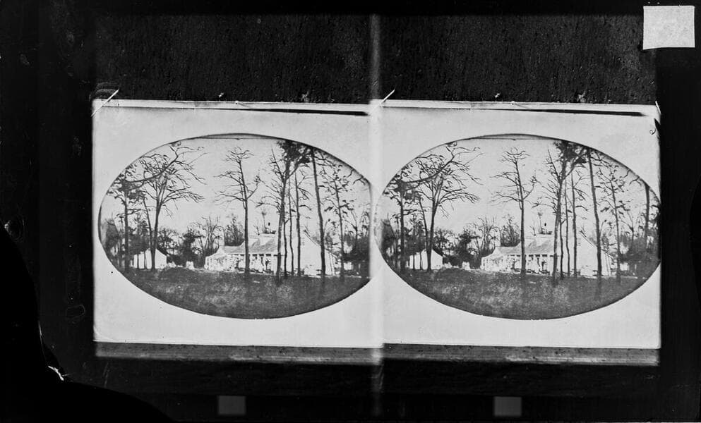 Group portrait of white teachers and other employees at the school. An Indian boy can be partially seen peeking around the stairs, at right. The year "1873" is carved in stone above doorway.