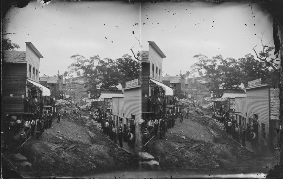 People gathered in front of stores in a small town. Some signs read: "Brite & Wick's Groceries," "Saloon," "Thornton's store."
