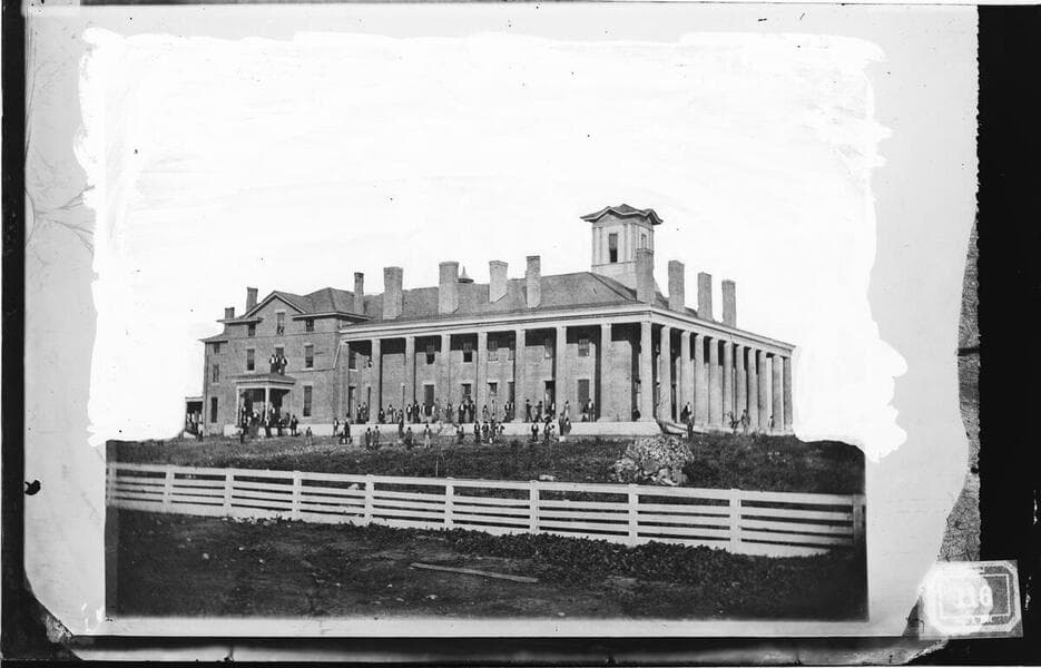 View of people standing on the steps outside a large building that served as an asylum for the Cherokee Nation.