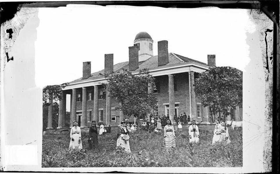 Rev. John Buttrick Jones and family on lower porch. Cherokee men and women are on upper porch and in window of seminary for the Cherokee Nation.