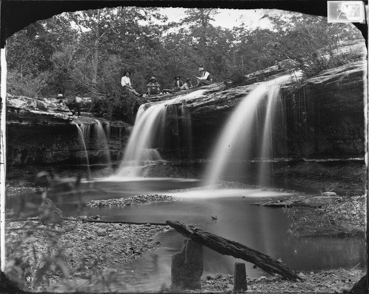 View of water cascading over rock, into river. Men are on top of rock in distance.