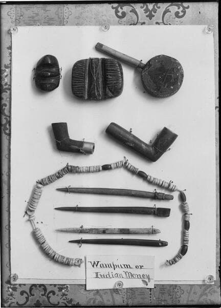 A view of a young Hopi Indian with a rag headband wearing two necklaces. One necklace is silver beads with coins interspersed and a silver crescent shaped pendant. The other necklace is beads (wampum) with 3 loops of larger bead hanging from it.