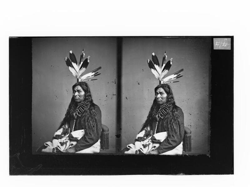 The man is wearing bear claw necklace, feather headdress, and holding beaded bag.