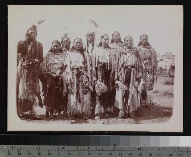 A disbound album of primarily portrait photographs of Plains Indians, taken by photographer William E. Irwin from the 1890s to early 1900s, in Indian Territory. His images document the Chiricahua Apache, Comanche, and Kiowa Indians who lived near Anadarko and Fort Sill, Oklahoma; some photographs may have been taken at Irwin's studio at Chickasha, Indian Territory. Besides the studio and field portraits, there are also candid views illustrating late 19th-century Plains Indians in their daily lives; several views of cowboys and cow herding; Fort Sill; tepees; landscapes; and one view of a Wichita Indian grass house or wickiup. Notable portraits include those of Geronimo, seated, posing with headdress and revolver; Appeahtone (Kiowa Chief) and his wife; and Quanah Parker (Comanche Chief) with two of his wives. Many of the photographs focus on Comanche and Kiowa Indians posing for studio portraits. These portraits depict infants and children, young women, mothers, scouts, and warriors, many identified by name. Named individuals include Poor Buffalo, White Buffalo, Lone Wolf, and Little White Shield, among others. Field photographs show Apache, Kiowa, and Comanche encampments; a Wichita grass house; both cowboys and Indians caring for their herds; and views in and around Anadarko and Fort Sill, Oklahoma.