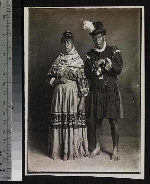 Studio portrait of Ute Indian man and woman.