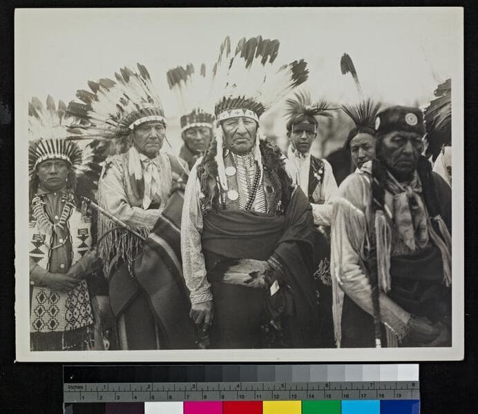 Photo of natives taking part in the Indian Ghost Dance wearing native dress and feather work.