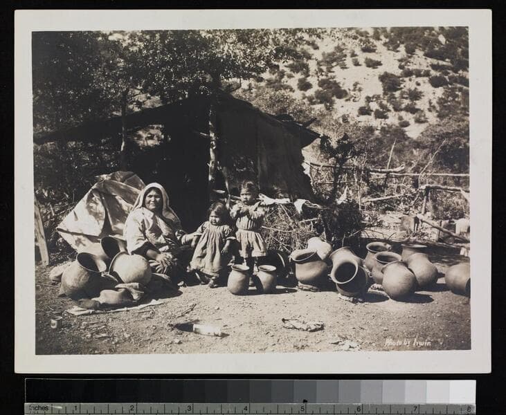 Horatio Rust (far left) and Indian women and children standing in a brush shelter. In the foreground are stone mortar and pestle; pottery.