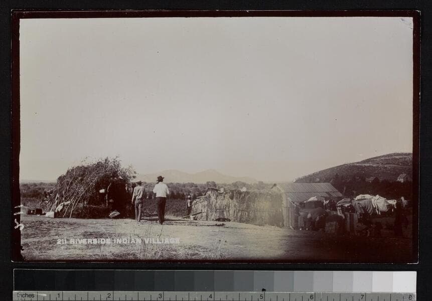 View of Indian children and a woman, with brush huts and dwellings in the hills of Riverside, California.
