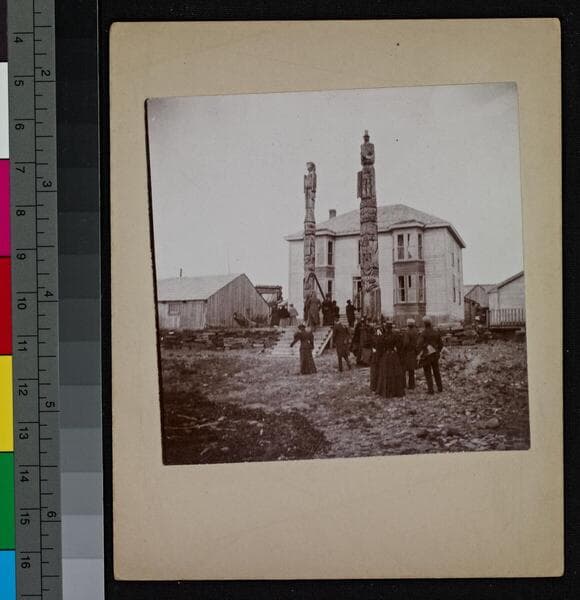 Totem poles standing in front of two-story building, Fort Wrangell, Alaska
