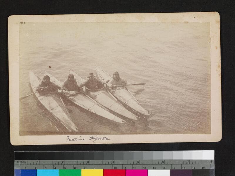 Image of Alaska natives in front of an umiak, with kayaks to the side . A pair of boots are in the foreground.