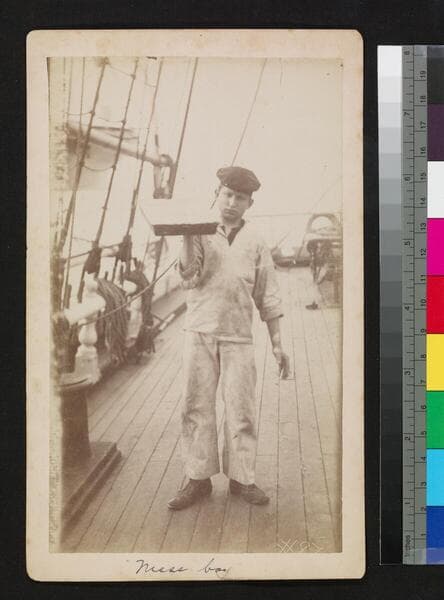 Image of crewman and small boy in sailor outfits on deck of unidentified ship.