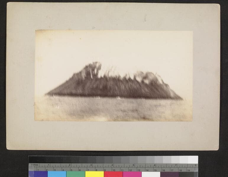 View of new and old Bogosloff Islands. New island and active volcano arose from the sea in the fall of 1883. "Corwin" first vessel to land and examine it