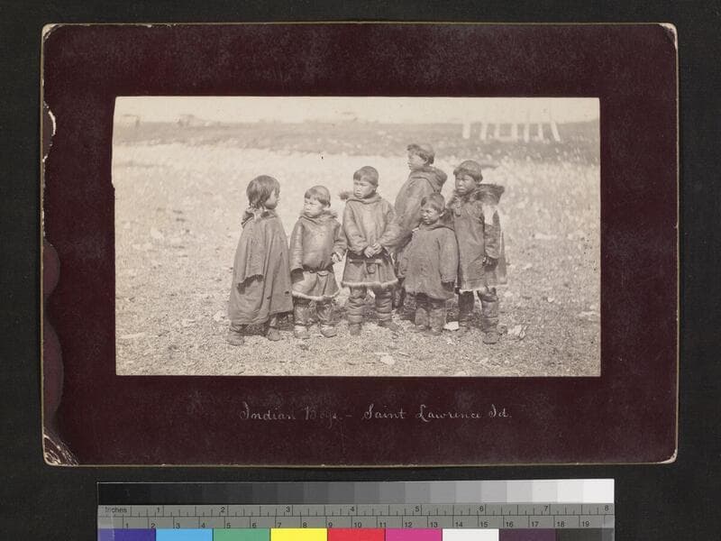 Image of Saint Lawrence Island Indian women and children outside of a hut.
