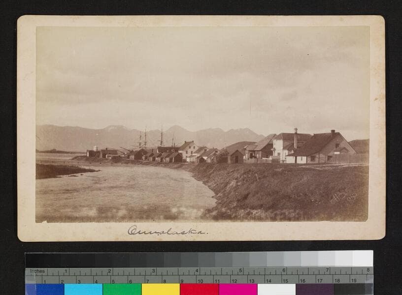 Image of birds eye view of small harbor town with snow capped mountains in the distance.