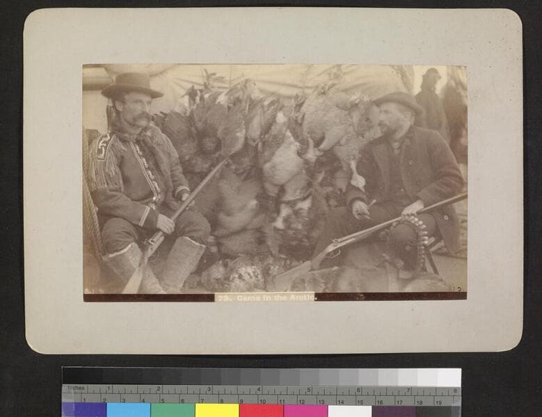 Image of two Caucasian men standing outside native house wit Alaska natives.