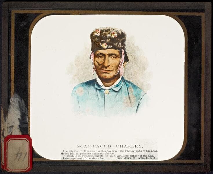 This collection contains lantern slides with both photographs and illustrations of the 1873-1873 Modoc War, a conflict fought in the lava beds at Tule Lake on the California-Oregon border between a small band of Modoc Indians and the United States Army. The lantern slides include images of Indian scouts for the U.S. Army; U.S. Army soldiers and camps, Modoc leaders and prisoners of war, and the lava beds that served as the Modocs' stronghold. Notable images include portraits of Modoc leaders Captain Jack and Winema (Toby) Riddle, shaman Curly-headed Doctor, and Indian scout Donald McKy. Within the collection, 26 photographs can be attributed to Eadweard Muybridge, 13 to Louis Heller, and 2 to Putnam & Valentine.