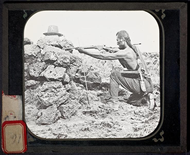 This collection contains lantern slides with both photographs and illustrations of the 1873-1873 Modoc War, a conflict fought in the lava beds at Tule Lake on the California-Oregon border between a small band of Modoc Indians and the United States Army. The lantern slides include images of Indian scouts for the U.S. Army; U.S. Army soldiers and camps, Modoc leaders and prisoners of war, and the lava beds that served as the Modocs' stronghold. Notable images include portraits of Modoc leaders Captain Jack and Winema (Toby) Riddle, shaman Curly-headed Doctor, and Indian scout Donald McKy. Within the collection, 26 photographs can be attributed to Eadweard Muybridge, 13 to Louis Heller, and 2 to Putnam & Valentine.