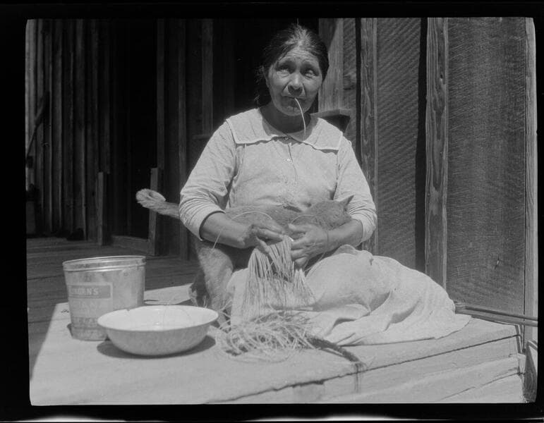 A view of an older Chemehuevi woman holding a basket in her lap.