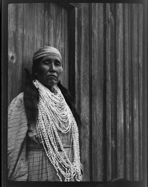 Grace Nicholson sitting in canoe, with Frank Ruben (Karok) paddling, on the Klamath River