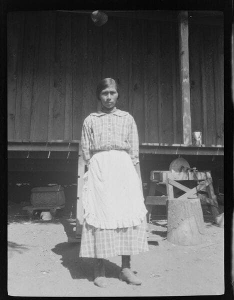 An unidentified Native American woman wearing necklace of dentalia, standing in front of house