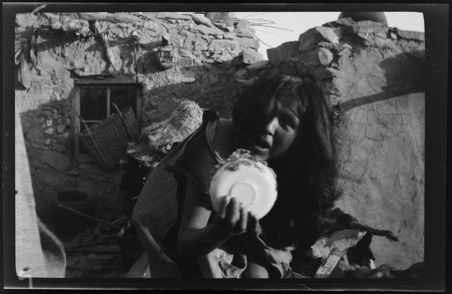 View of Hopi Indian wrapped in blanket and pueblo buildings, with kiva entrance in background.
