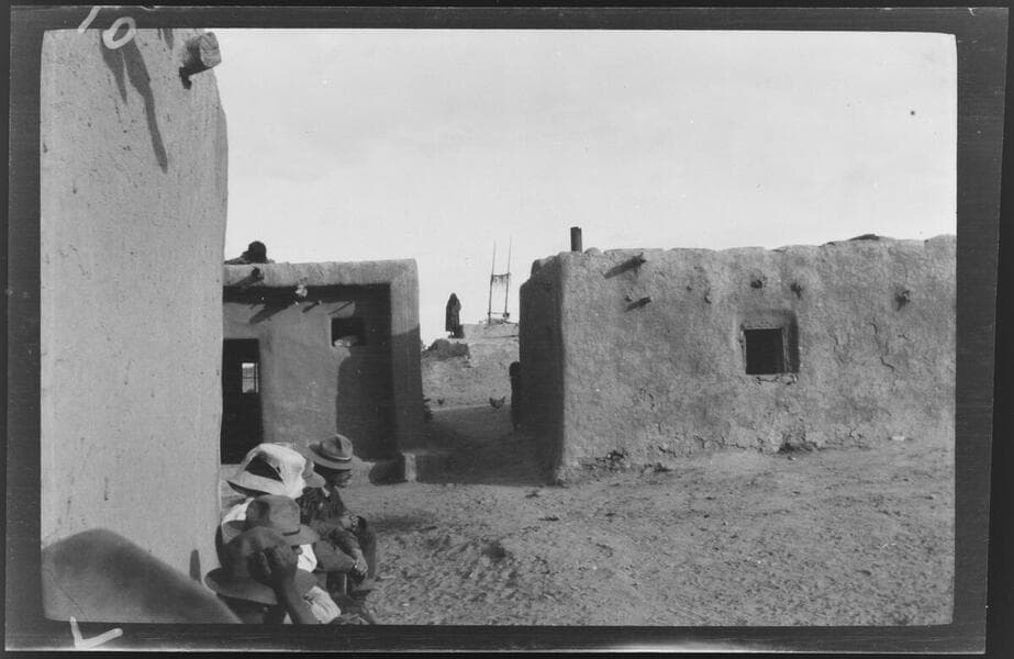 View of Hopi Indian wrapped in blanket and pueblo buildings, with kiva entrance in background.
