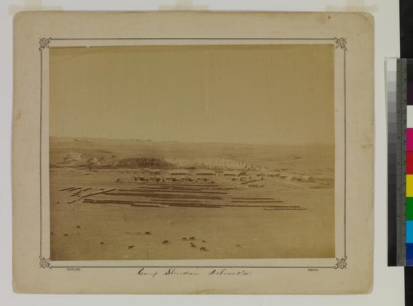 Views of frontier United States Army forts in Wyoming and Nebraska made by Pvt. Charles Howard, 1876-1877, and two views of Fort Wingate, New Mexico, ca. 1870s by an unidentified photographer. The photographs are mostly broad views of the military posts and their surrounding landscapes, showing cavalry, barracks and other buildings. The forts illustrated are Camp Canby, Camp Sheridan and Camp Robinson in Nebraska; Fort Fetterman, Fort Laramie and Fort McKinney in Wyoming Territory; and Fort Wingate in New Mexico. Besides views of the forts, there is one view of the town of Cheyenne; the Red Cloud Indian Agency, Nebraska; and a group portrait of soldiers and their families at Fort Wingate.
