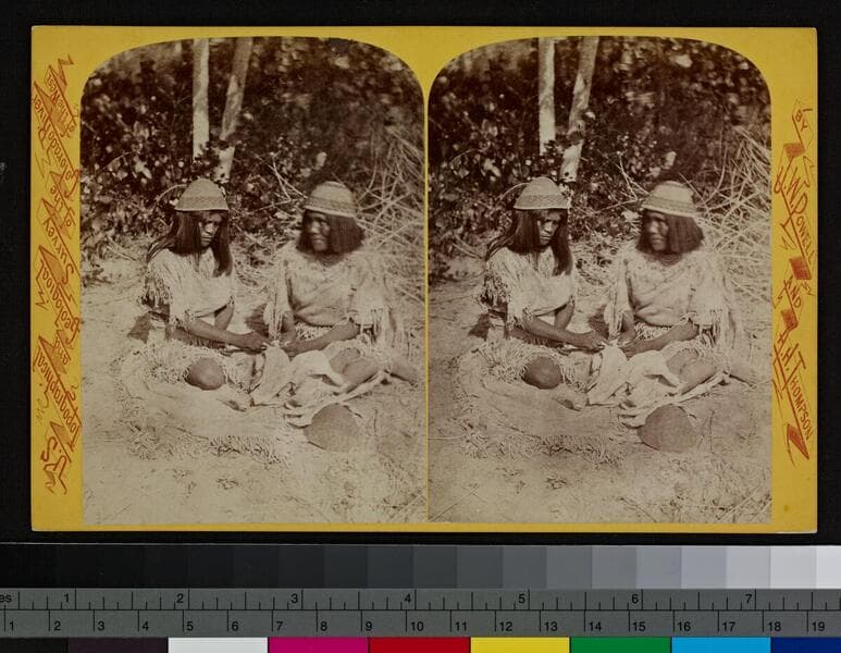 Two Paiute girls in native dress, leaning against rock.