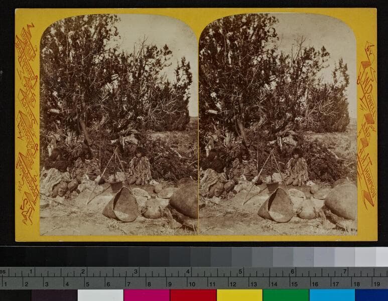 A group of Indians seated around a small tree, in a field of flowers. There may be a person dancing (blurred). Tepees can be seen in the background.