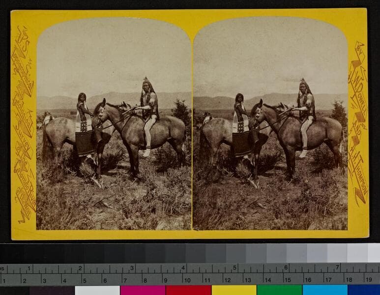 Indian men and women in plaza of pueblo, wearing dance regalia, body paint and holding objects. Spectators are seen on the walls of the pueblo buildings.