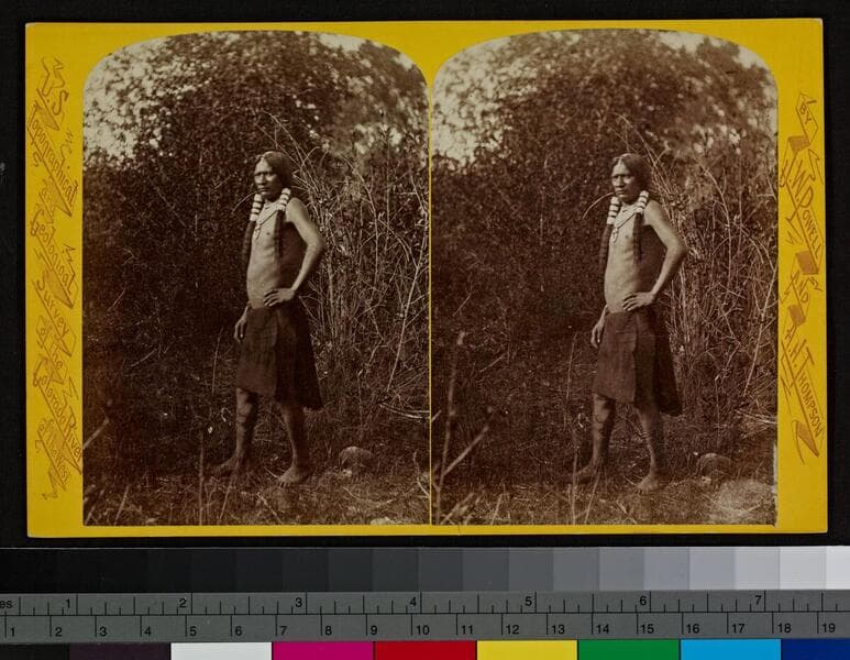 An Ute man wearing body paint and holding rifle, seated on horse. An Ute girl is seated on a horse next to him.