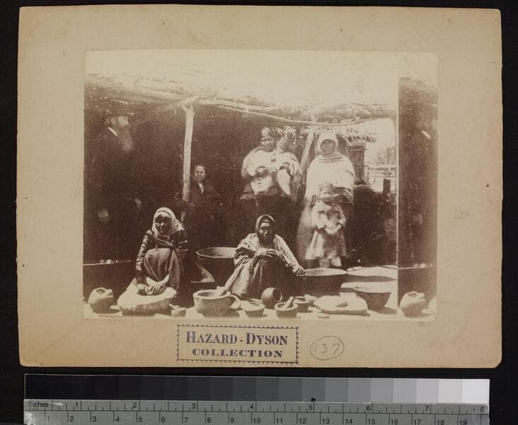 Horatio Rust (far left) and Indian women and children standing in a brush shelter. In the foreground are stone mortar and pestle; pottery.