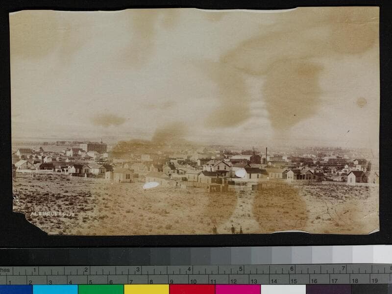 View of train station, with people and horses and wagons. Railroad cars are on tracks, and the wagon at center says "Wells Fargo" on the side. The wagon at left says "City Omnibus Line."