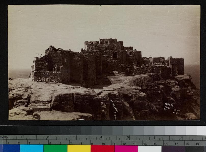 View of pueblo buildings on top of mesa, with desert beyond. A Hopi man is seen in the pueblo, at a distance.