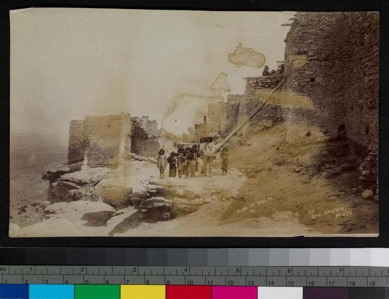 View of pueblo buildings on top of mesa, with desert beyond. A Hopi man is seen in the pueblo, at a distance.