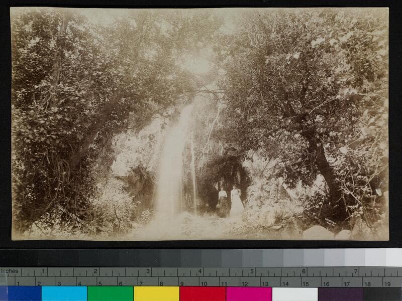 Image of a landscape view of Elliot Falls waterfall near Newtown; homes visible along left bank; woman walking on path at left; man standing on the bank near the falls at center.