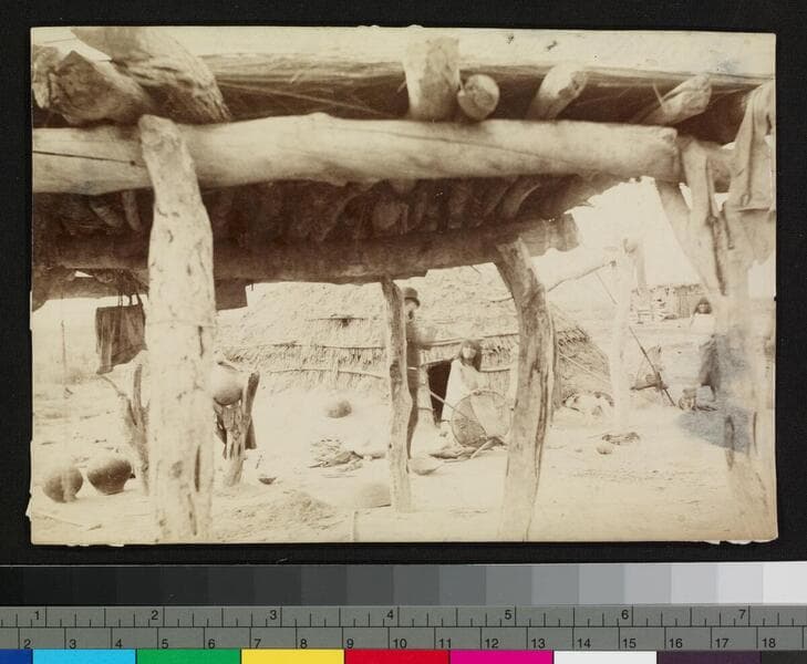 Photo of a native family sitting outside of an adobe building, one woman using a metate.