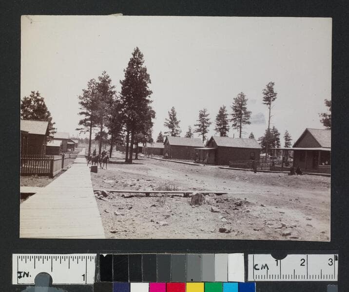 Small houses or cabins in Flagstaff, a board sidewalk running between.