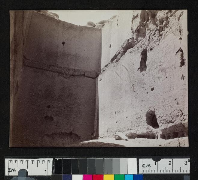Interior of the ruins at Casa Grande showing graffiti carved into the walls.