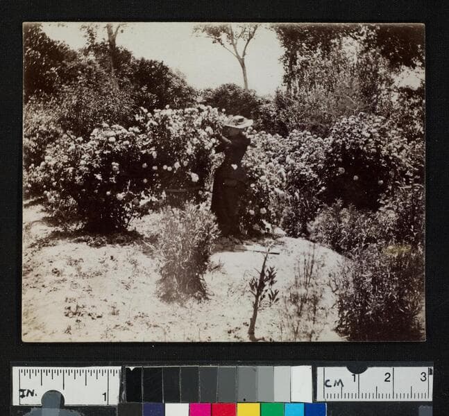Scene in the town of Florence, Arizona. A man and woman in front of house and garden.