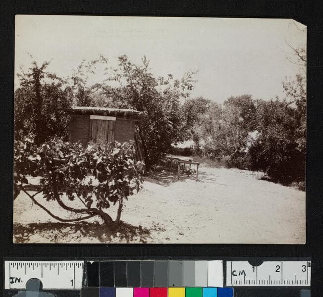 Scene in the town of Florence, Arizona. A woman standing in a garden.
