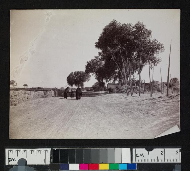 People on road in pueblo or settlement