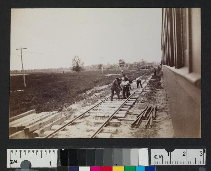 Men working on railroad tracks that appear to have been under cut by a flash flood.