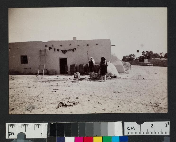 Pueblo Indian women in front of adobe building