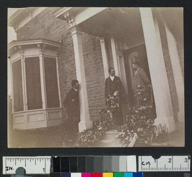 Men and women on porch of a building