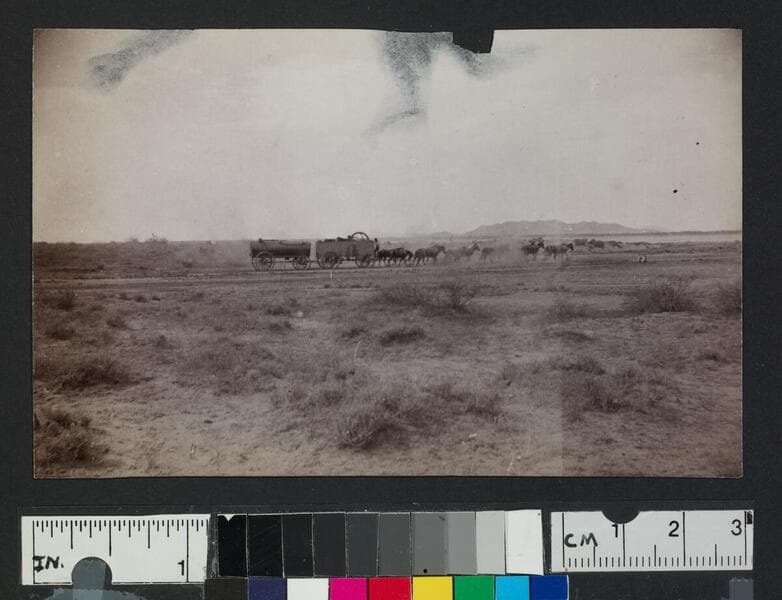 Horses pulling wagons through the desert